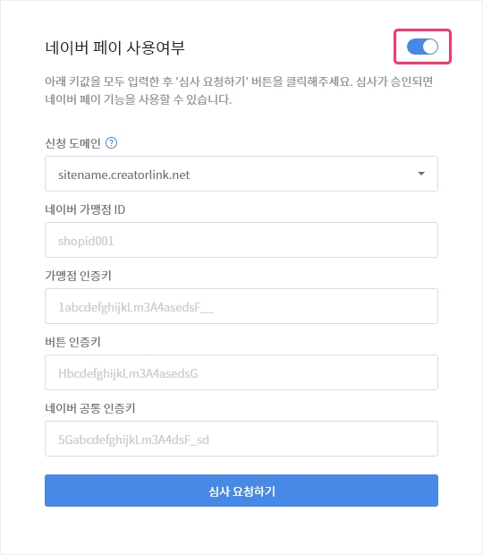14. 1차 승인 메일에서 받은 네이버 가맹점 ID, 가맹점 인증키, 버튼 인증키, 네이버 공통 인증키를 각각 입력해 주세요.