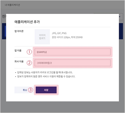 5) 앱 이름과 회사 이름을 입력한 뒤 저장 버튼을 클릭해 주세요.