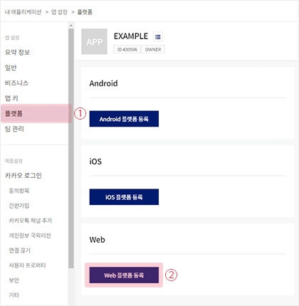 2) 플랫폼 메뉴로 이동한 뒤 Web 플랫폼 등록 버튼을 클릭해 주세요.
