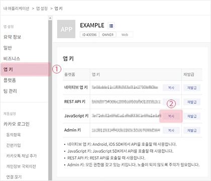 1) 앱 키 메뉴로 이동한 뒤 JavaScript 키를 복사해 주세요.