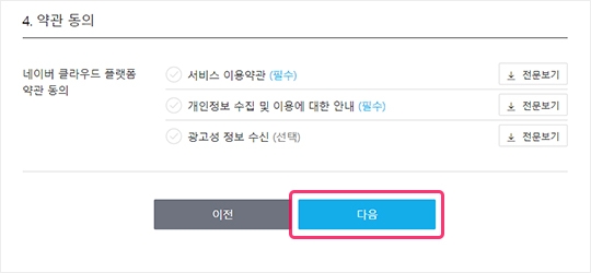4) 회원 유형을 법인 사업자 또는 개인 사업자로 선택한 경우 다음 버튼을 클릭해 주세요.