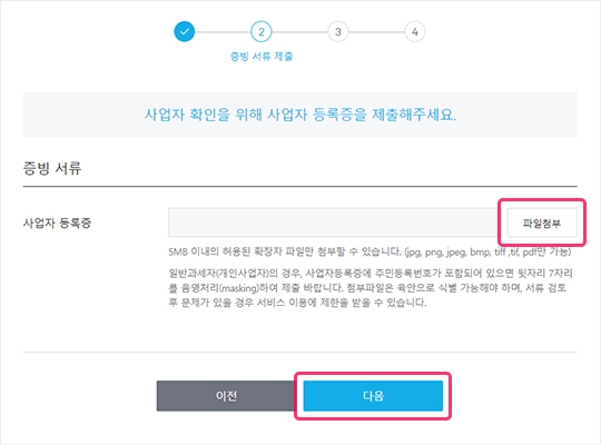 5) 증빙서류로 사업자 등록증을 첨부한 후 다음 버튼을 클릭해 주세요.