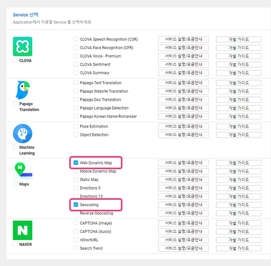 6) Service 선택에서 Web Dynamic Map과 Geocoding을 선택해 주세요.