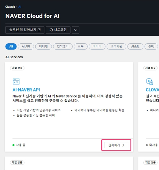 3) AI·NAVER API의 관리하기 버튼을 클릭해 주세요.