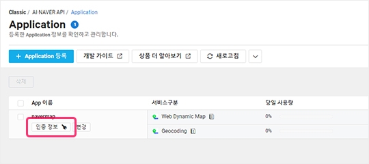 4) 등록된 App의 인증 정보 버튼을 클릭해 주세요.