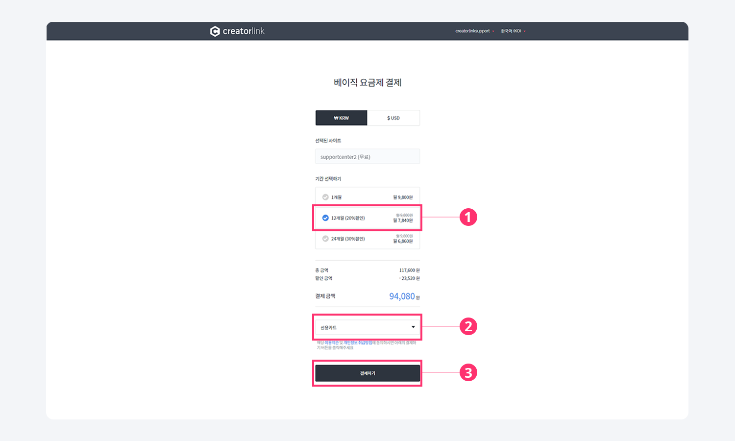 3. 원하는 기간과 결제 수단을 선택 후 결제하기 버튼을 클릭해 주세요.