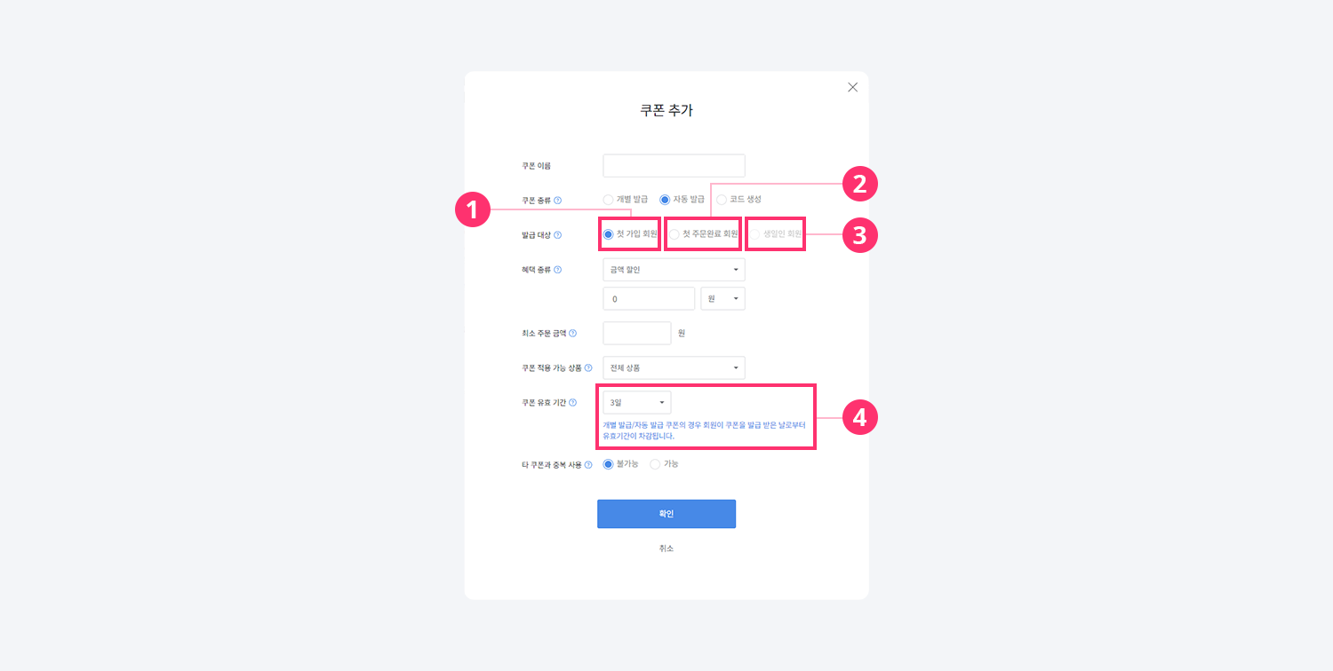 3-2. 자동 발급: 쿠폰을 발행할 때 발급 대상을 설정하면 조건에 따라 쿠폰이 자동으로 지급됩니다.