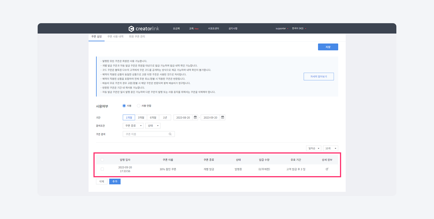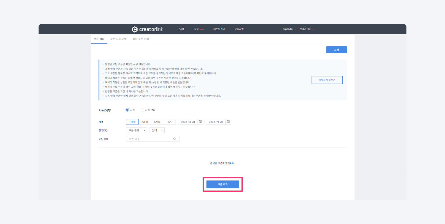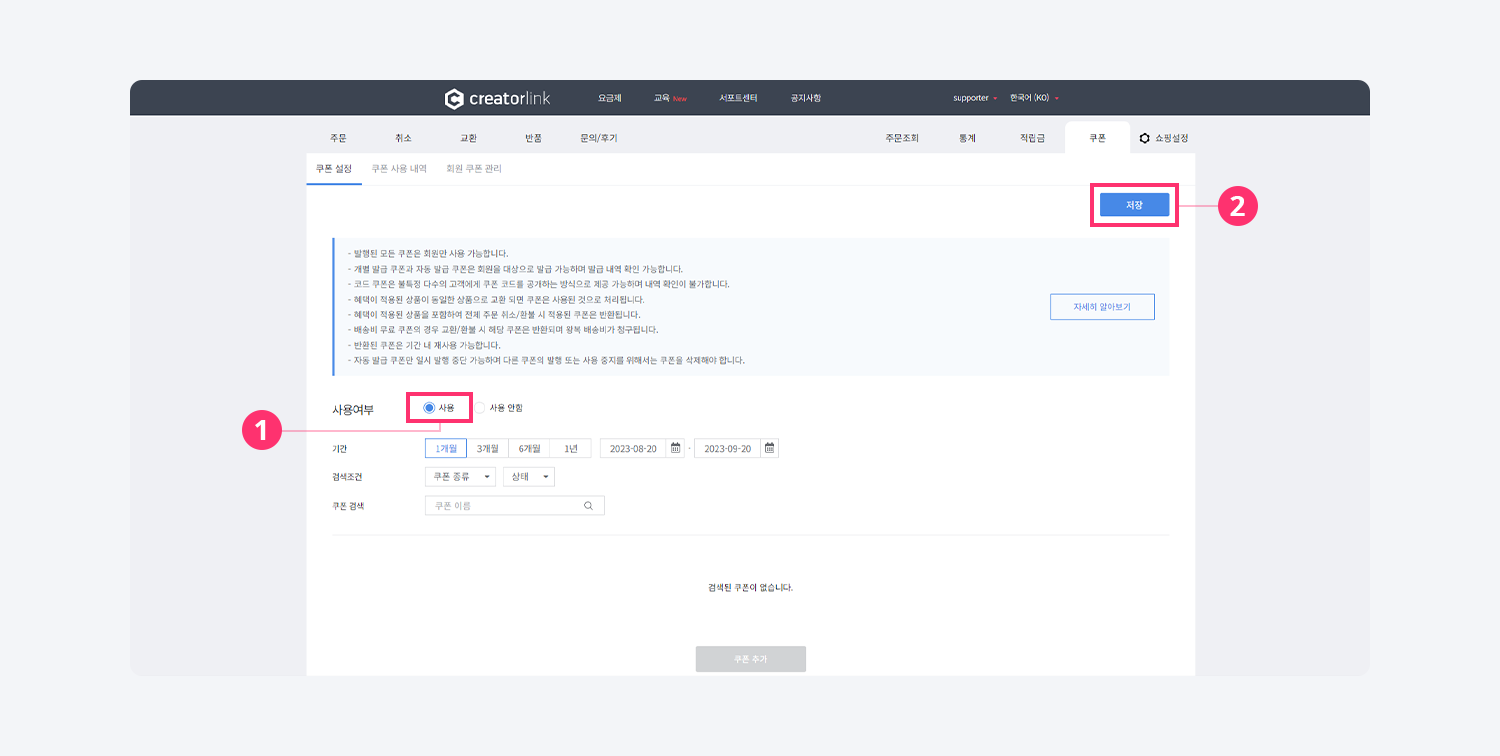 사용 여부 옵션을 사용 으로 설정하고 상단 저장 버튼을 클릭하면 쿠폰 추가 버튼이 활성화 됩니다.