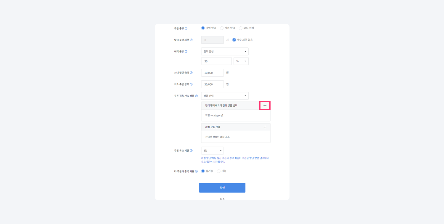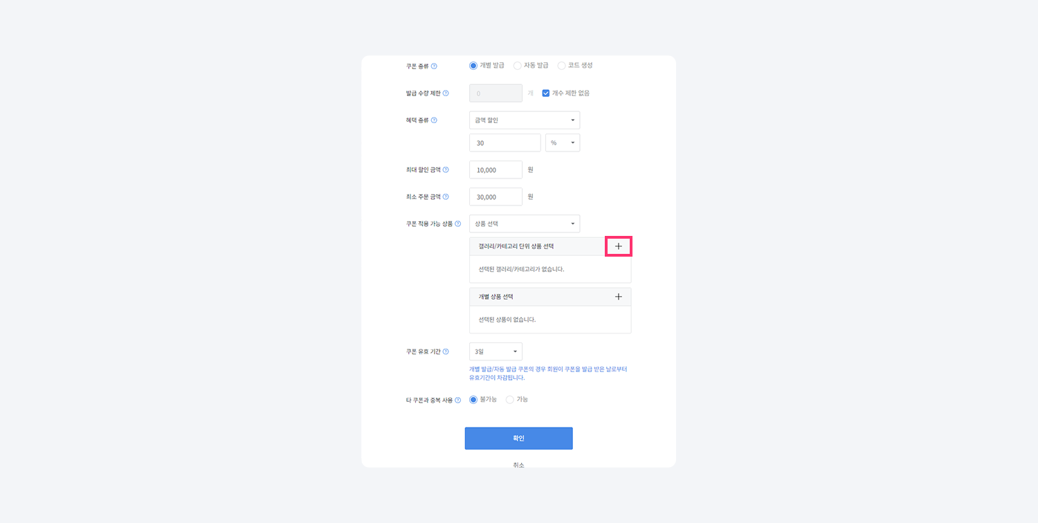 쿠폰 적용 가능 상품을 상품 선택으로 설정한 경우 아래에 갤러리/카테고리 단위 상품 선택과 개별 상품 선택 템플릿이 활성화 됩니다.