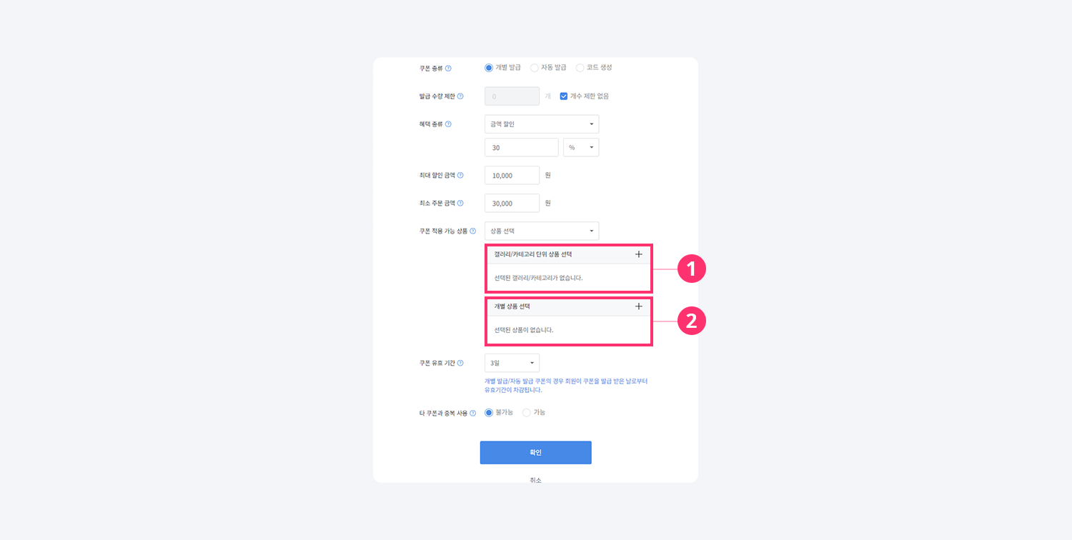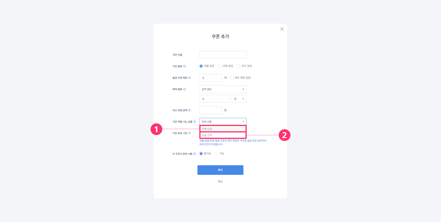 2) 상품 선택: 쿠폰 적용 가능한 상품을 지정할 수 있습니다.