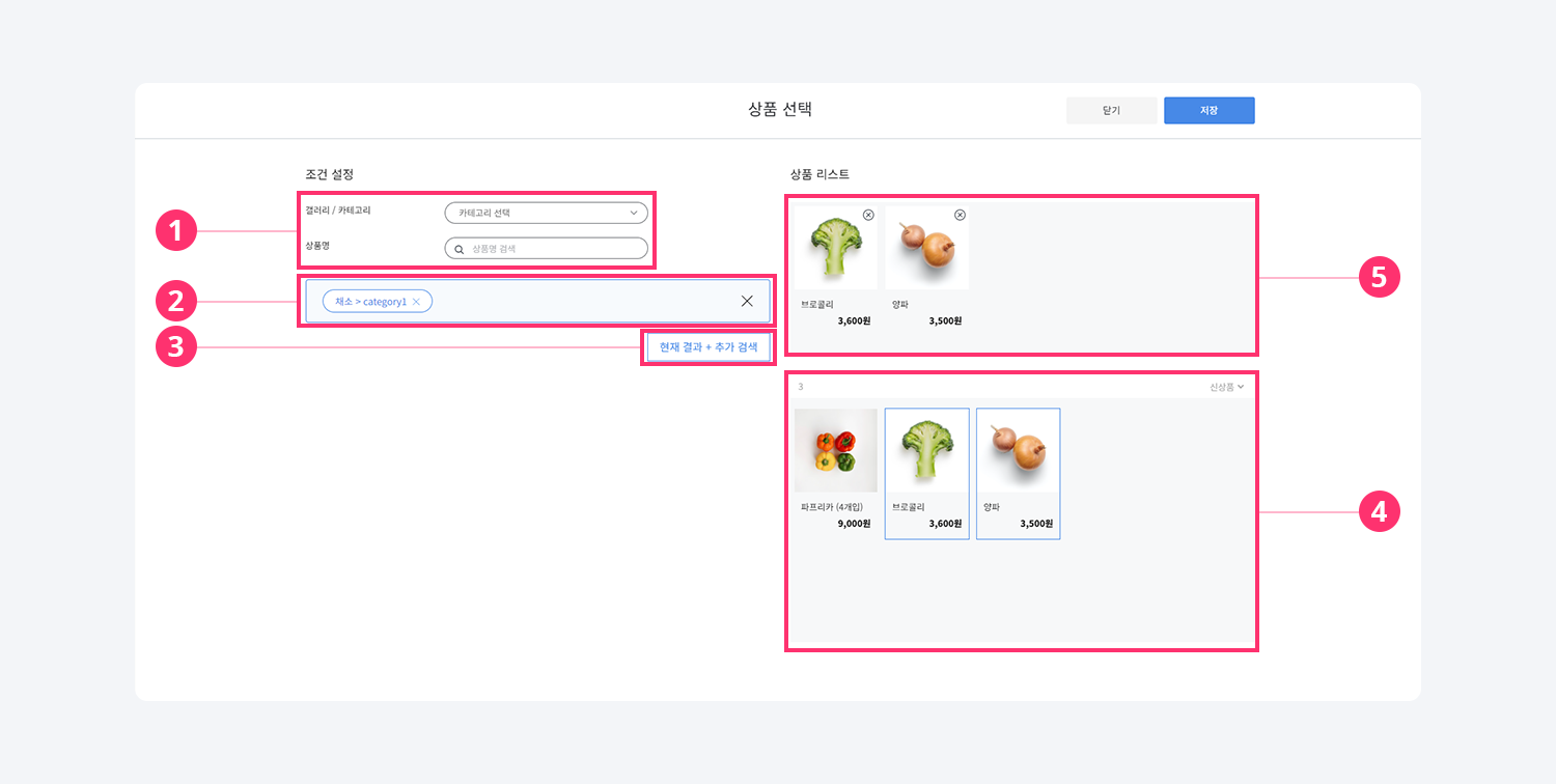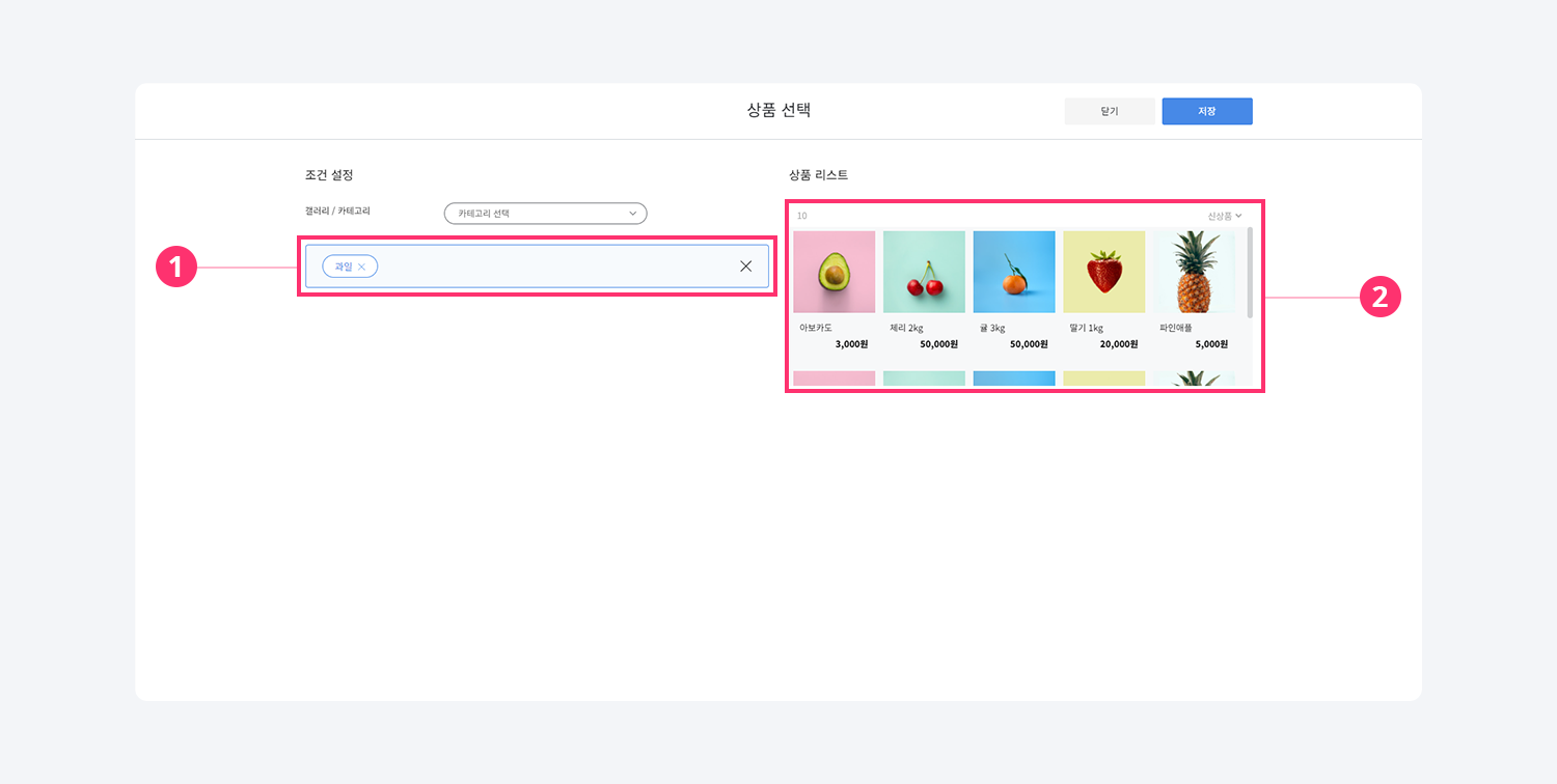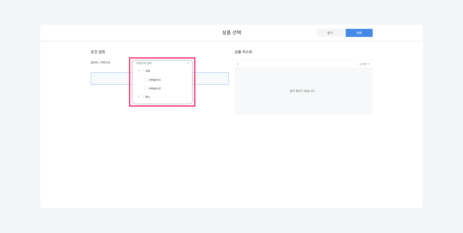 갤러리/카테고리 단위 상품 선택을 원하는 경우 + 버튼을 클릭해 상품 선택 팝업을 열어주세요.