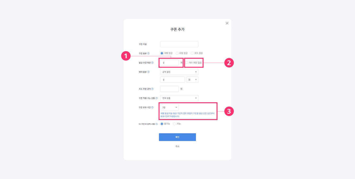 2) 개수 제한 없음: 쿠폰 수량 제한이 필요하지 않은 경우 개수 제한 없음 항목에 체크하면 무제한 발급 가능한 쿠폰으로 제작할 수 있습니다.