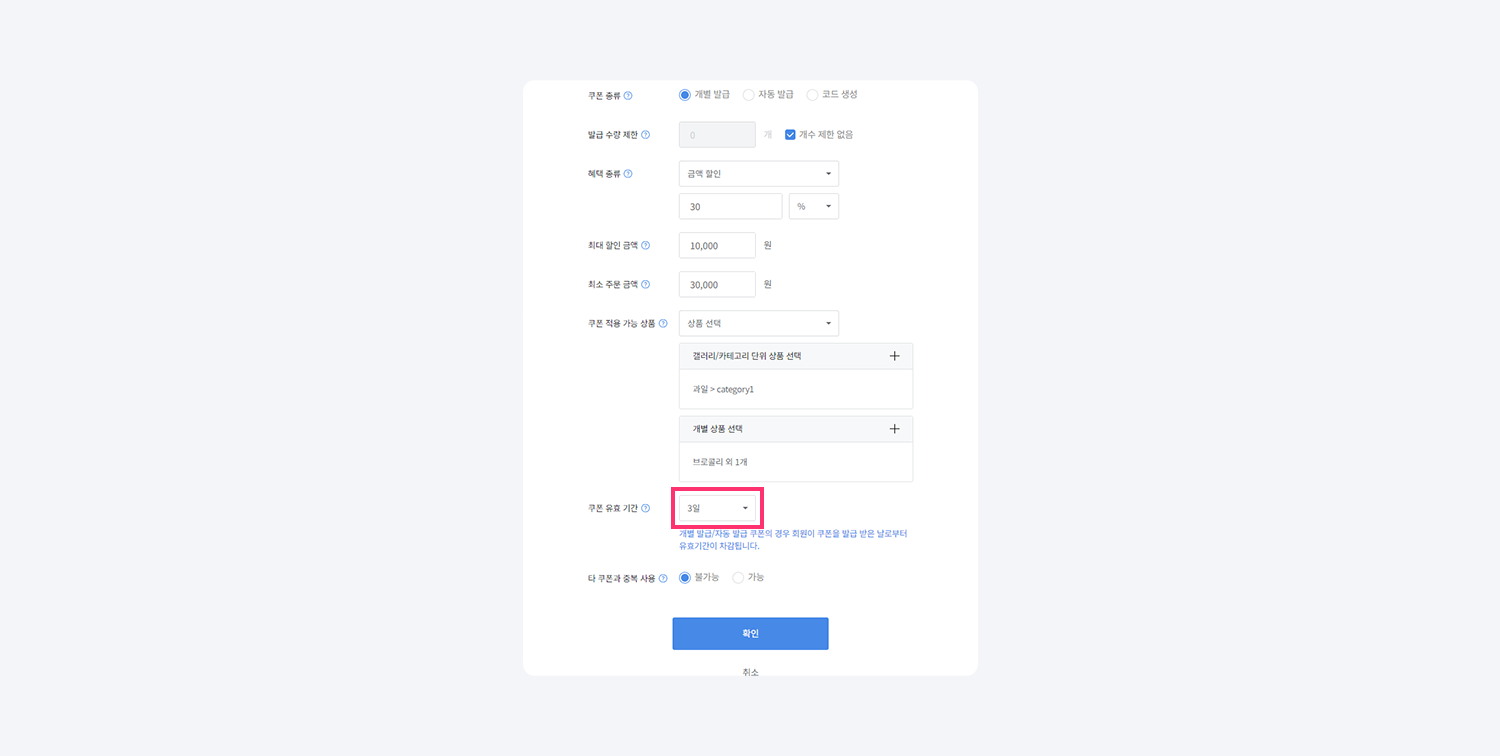 옵션을 가능으로 설정하면 다른 쿠폰과 중복 사용이 가능해져 상품이 무료 또는 원가 이하로 판매되는 경우가 발생할 수 있으니 신중하게 사용해야 해요!