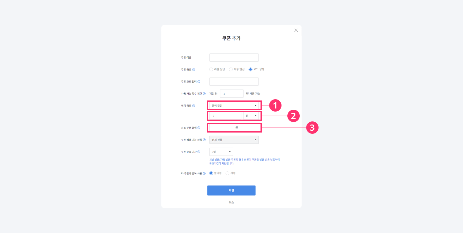 3) 최소 주문 금액: 한 주문서의 상품 합계 금액(배송비 제외) 이상 구매해야만 쿠폰을 사용할 수 있도록 설정할 수 있습니다.