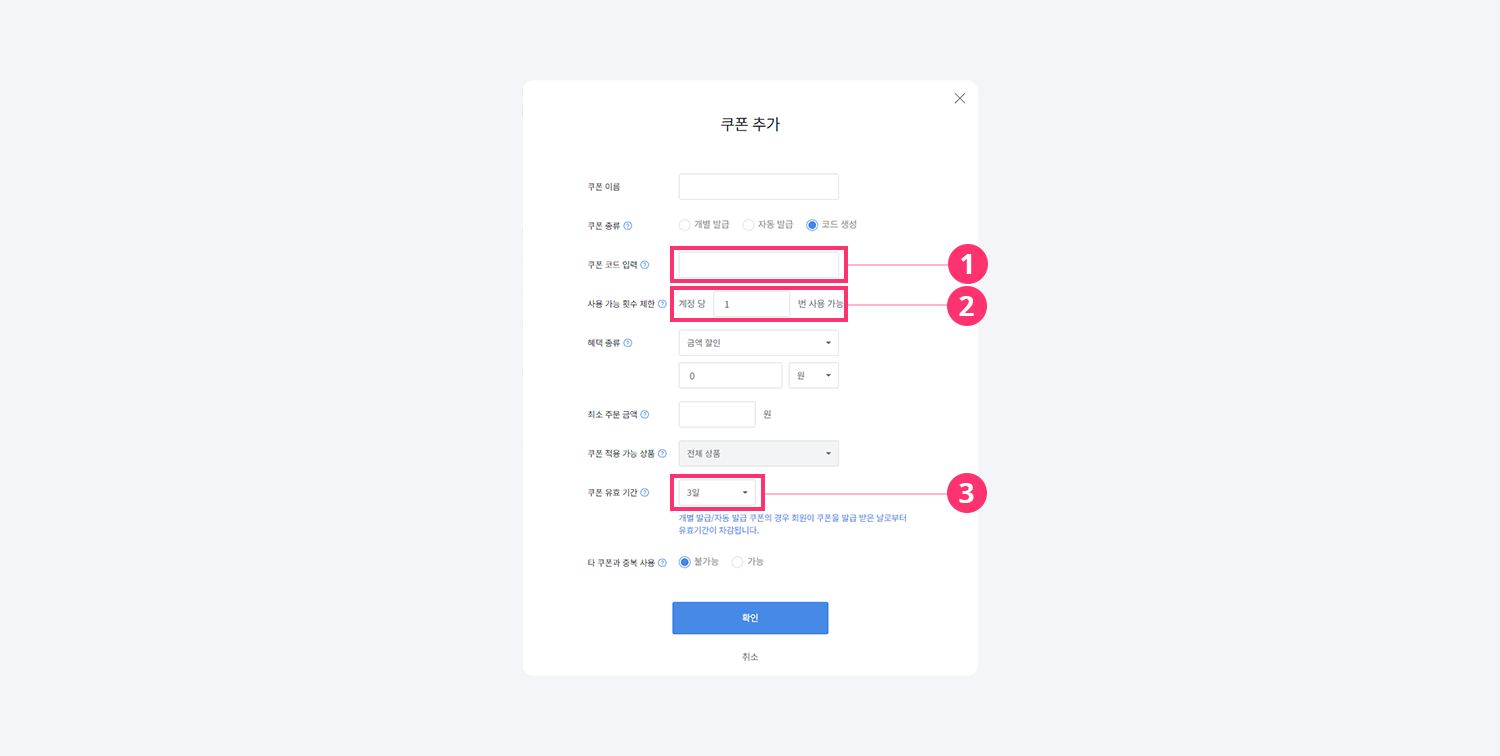 2) 사용 가능 횟수 제한: 주문자가 쿠폰 유효기간 내 설정된 횟수 내에서 코드를 재사용 할 수 있도록 설정할 수 있습니다. 동일 주문자 여부는 주문자 정보에 입력된 전화번호를 기준으로 판단됩니다.