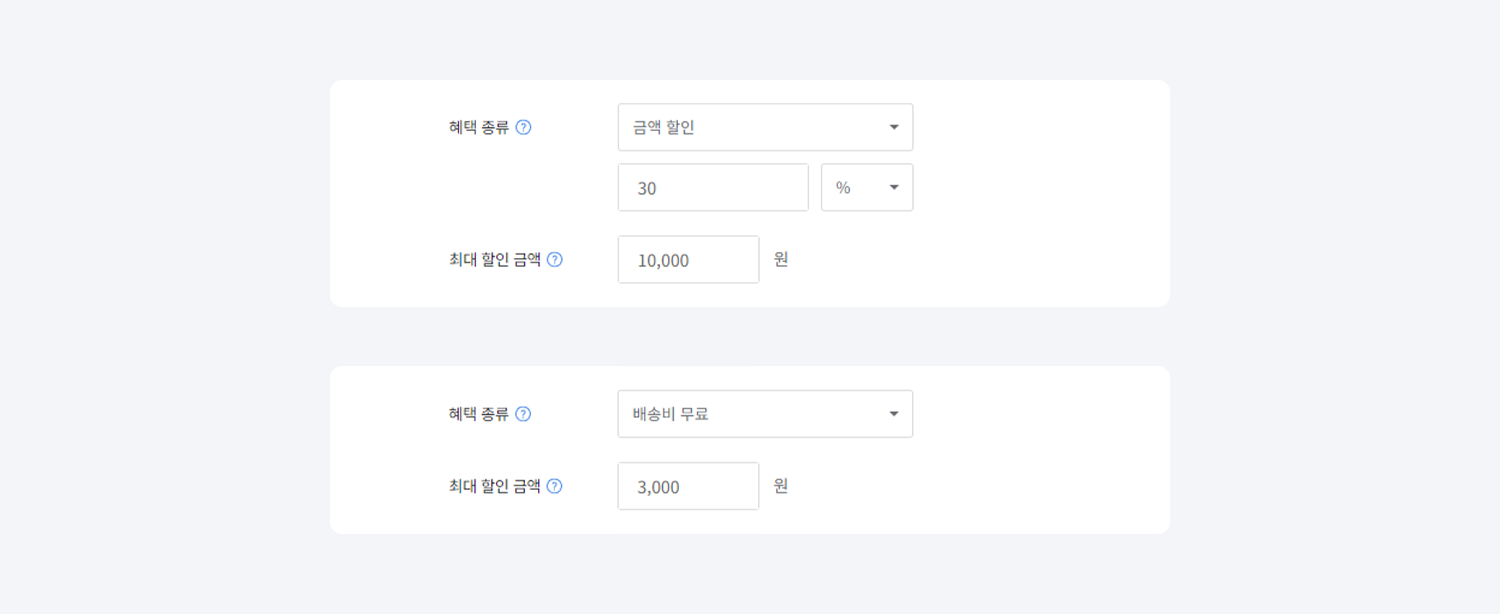 [혜택 종류 > 금액 할인 > % (단위)] 또는 [혜택 종류 > 배송비 할인] 선택 시 최대 할인 금액 설정 항목이 활성화 됩니다.