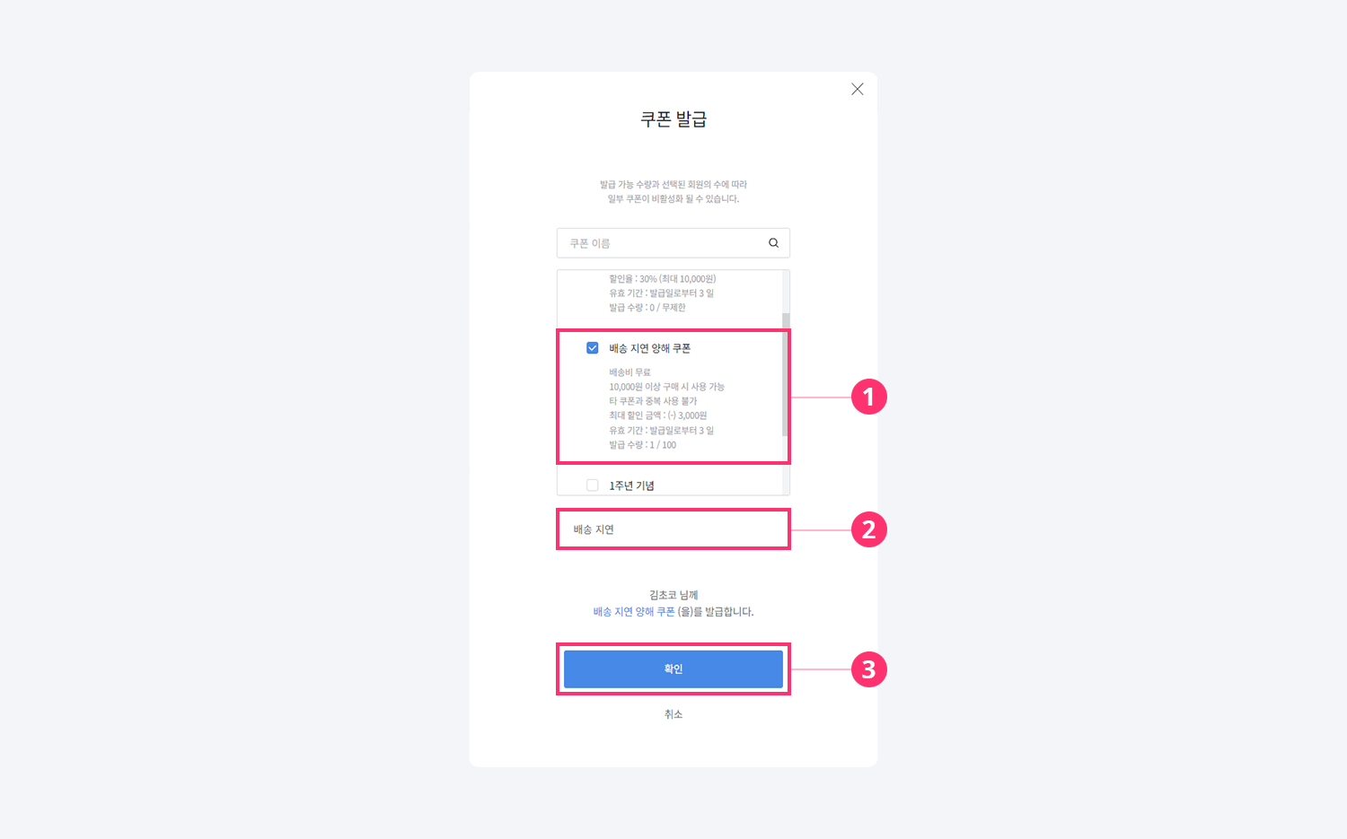쿠폰 발급 팝업에서 원하는 쿠폰을 선택하고 하단 발급 내용을 입력한 뒤 확인 버튼을 클릭해 주세요.