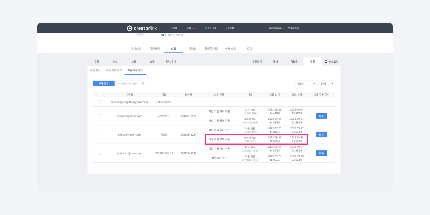 회원 쿠폰 관리 페이지에서 회원에게 쿠폰이 지급된 것을 확인할 수 있어요.
