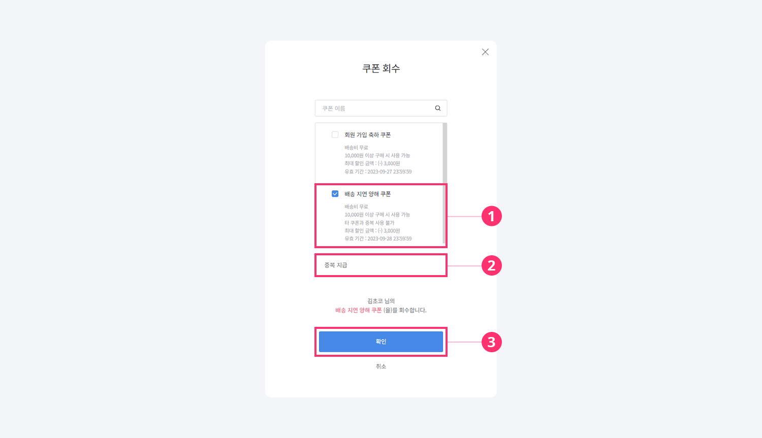 쿠폰 회수 팝업에서 회수하고자 하는 쿠폰을 선택하고 내용을 입력한 뒤 확인 버튼을 클릭해 주세요.