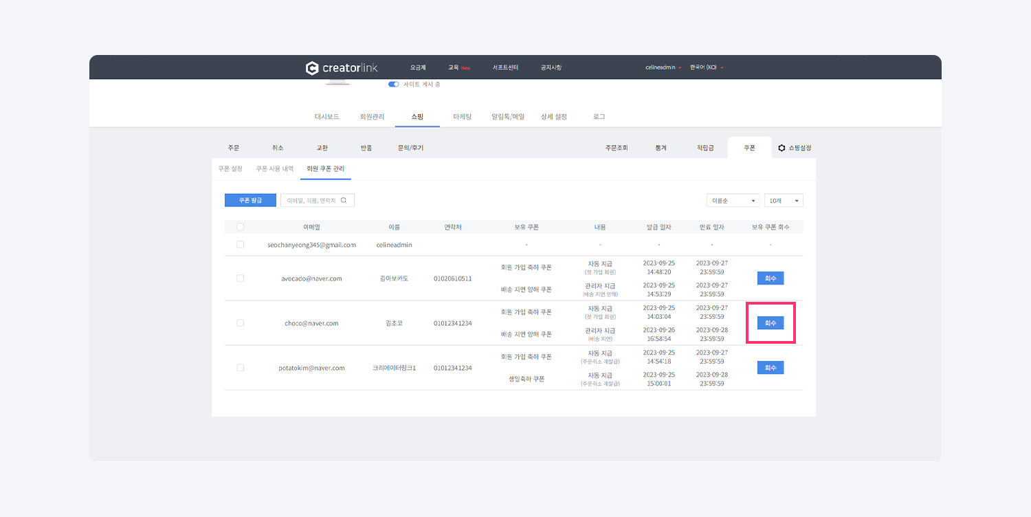 회원 별 보유 쿠폰이 상이하기 때문에 화면 우측에 회원 별로 회수 버튼이 독립되어 있어요. 쿠폰 회수를 원하는 회원의 회수 버튼을 클릭해 주세요.