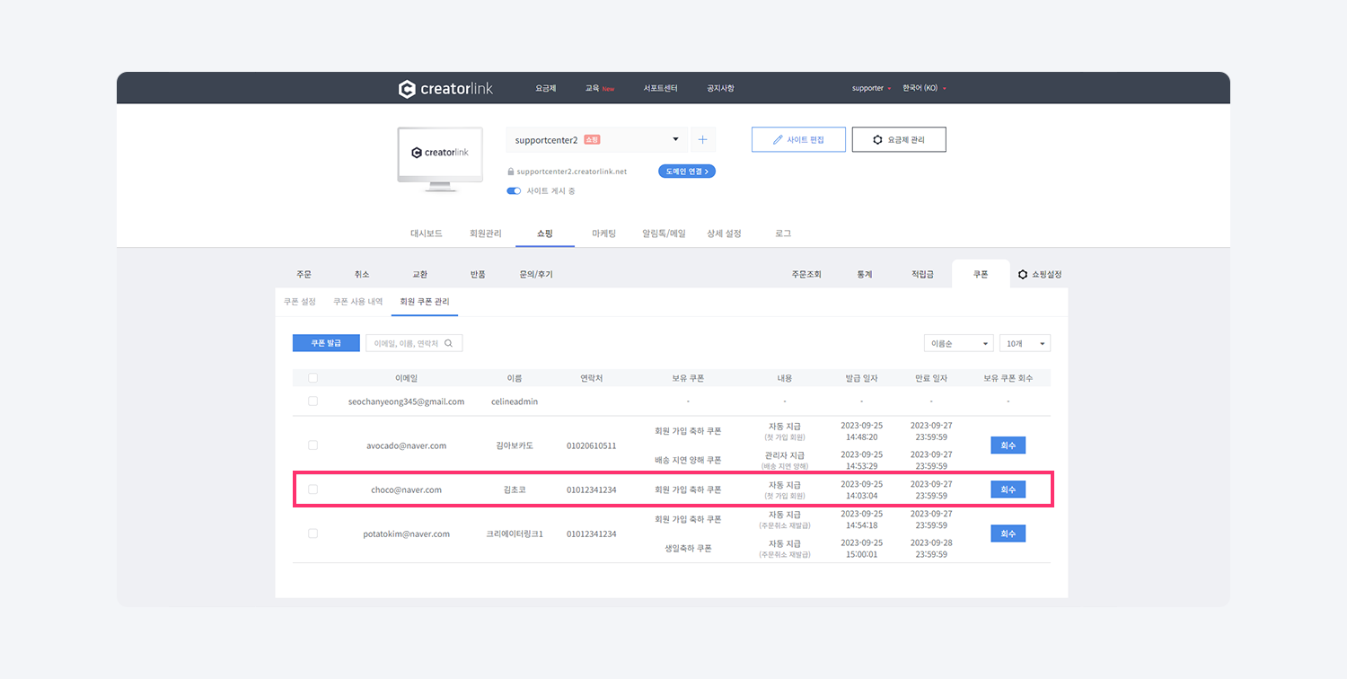 회원 관리하기 페이지에서 고객의 쿠폰을 확인하고 관리할 수 있어요.