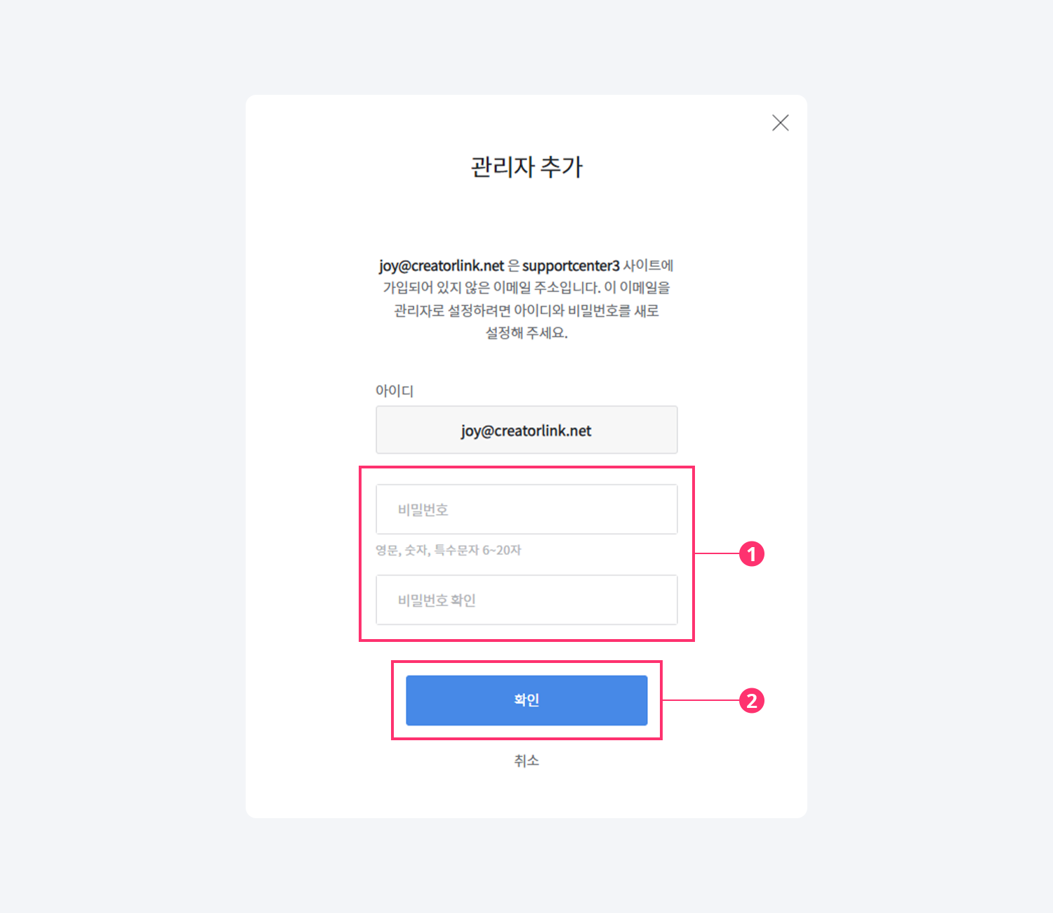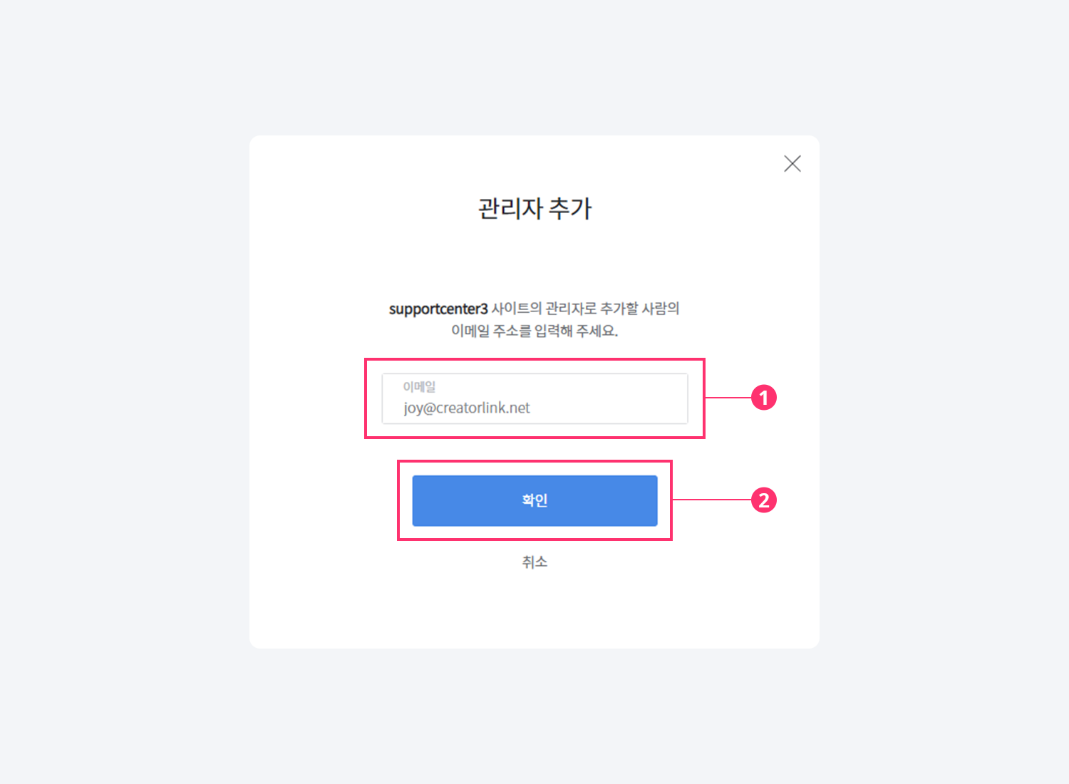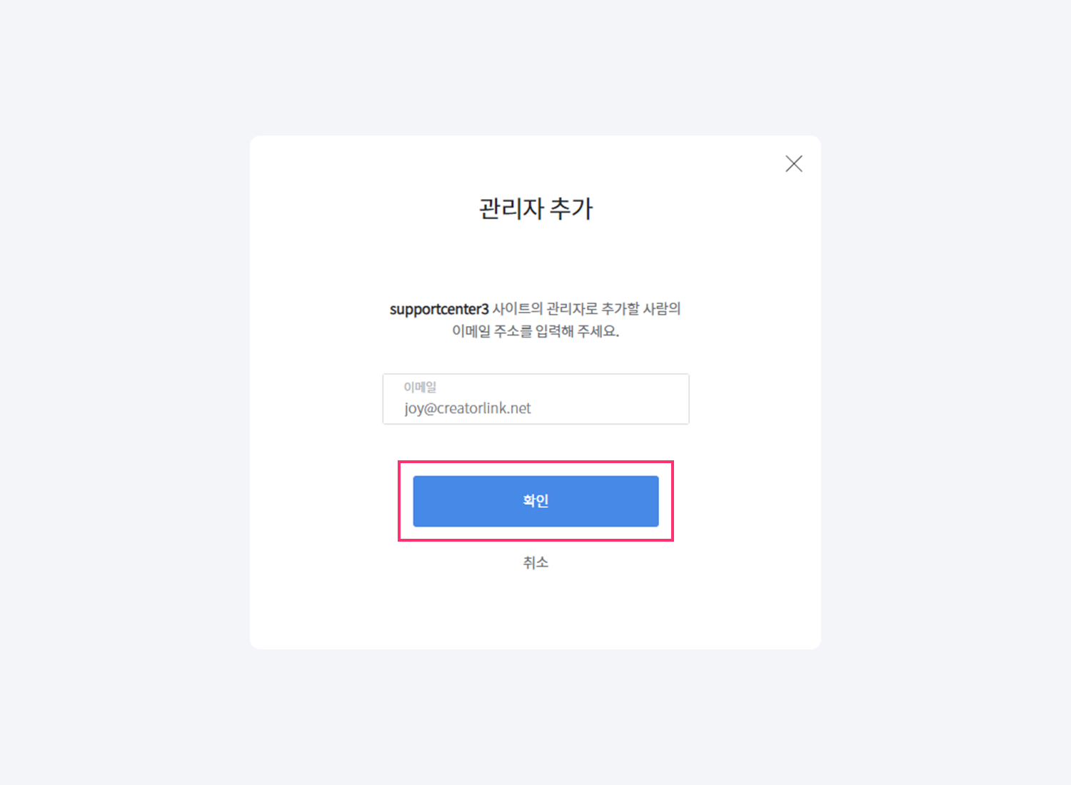 3. 권한을 부여하려는 회원의 아이디(이메일)를 입력하고 확인 버튼을 클릭해 주세요.