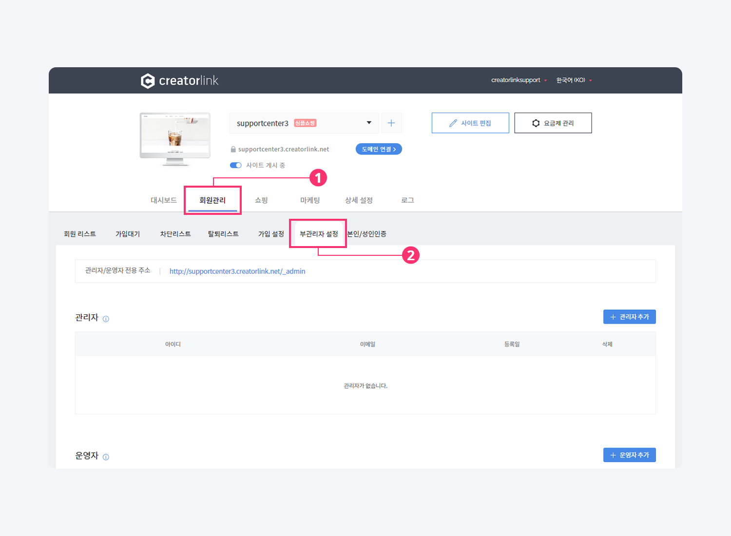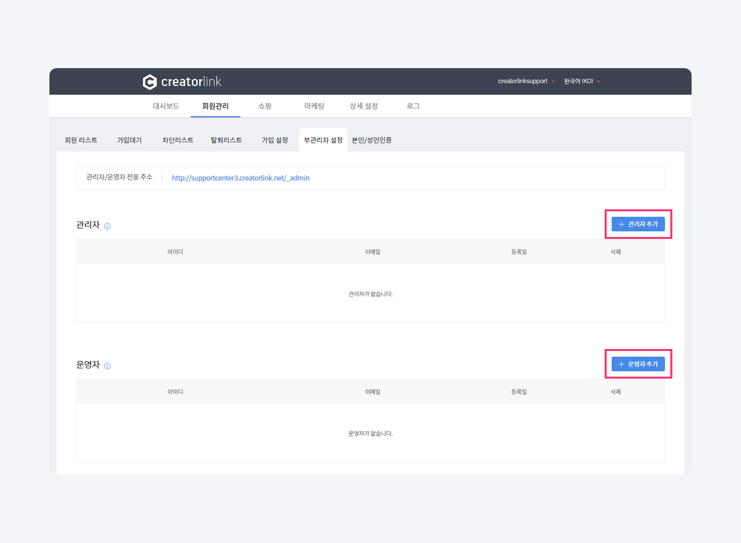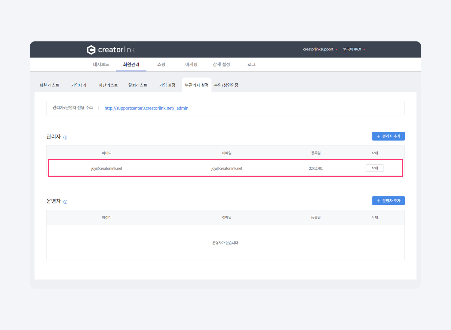 1. 크리에이터링크 관리자 페이지 > 회원관리 > 부관리자 설정을 클릭해 주세요.