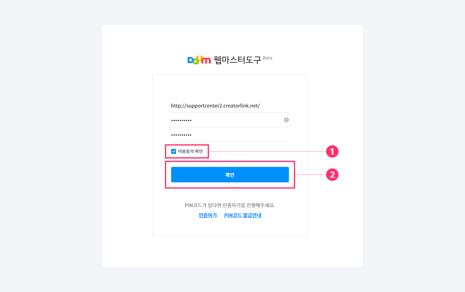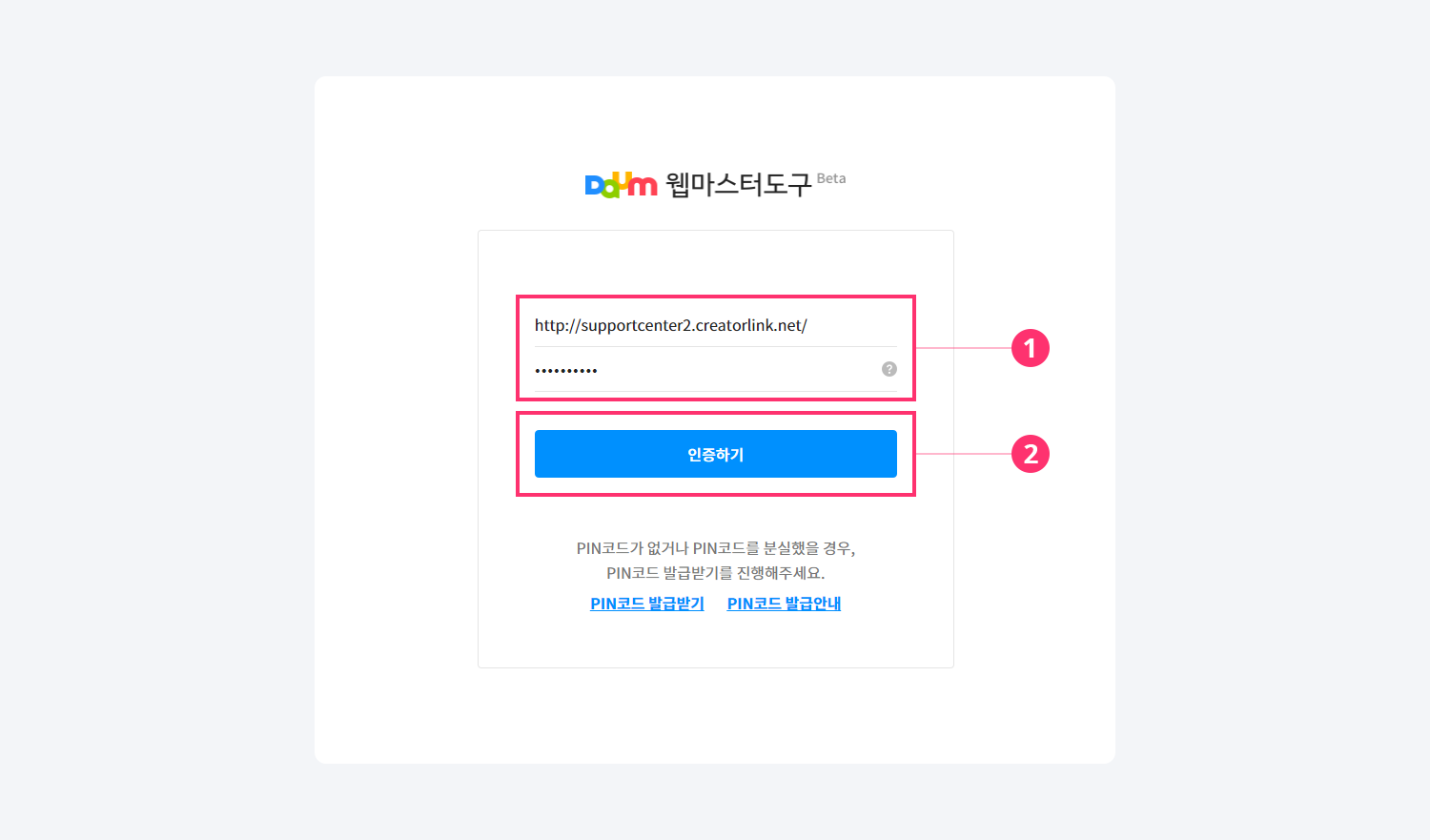 8. 사이트 URL과 PIN코드(비밀번호)를 입력하고 인증하기 버튼을 클릭해 주세요.