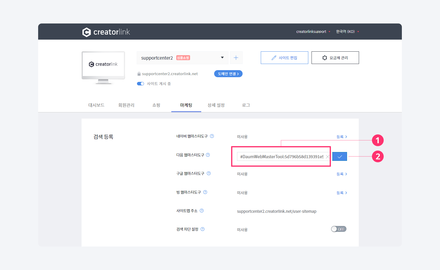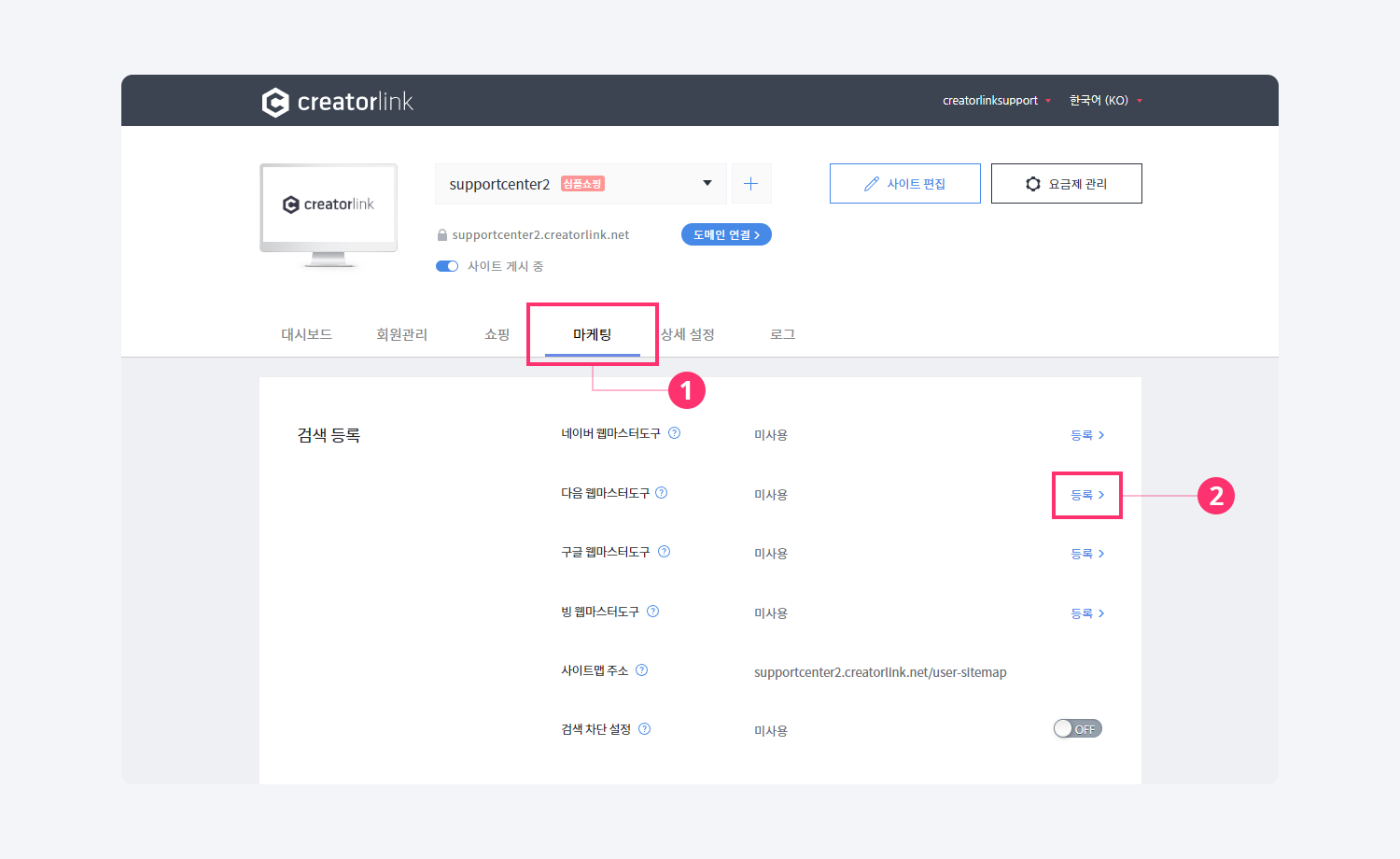 5. 크리에이터링크 관리자 페이지의 마케팅 > 검색 등록 > 다음 웹마스터도구 등록 버튼을 클릭해주세요.