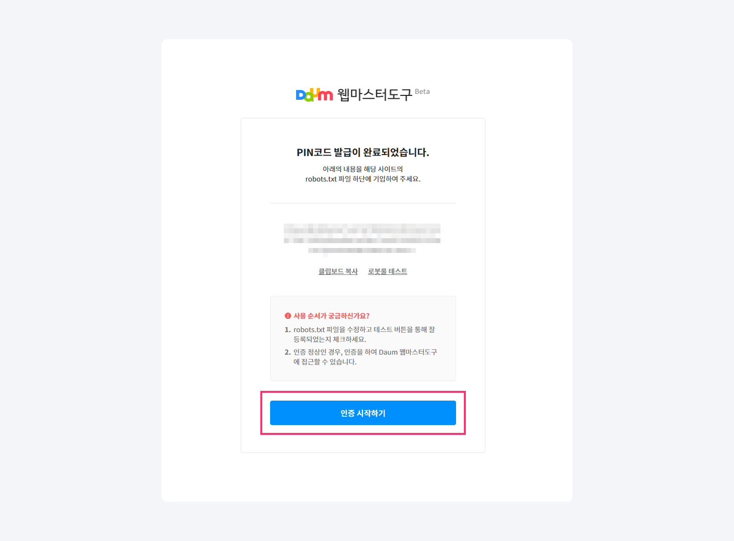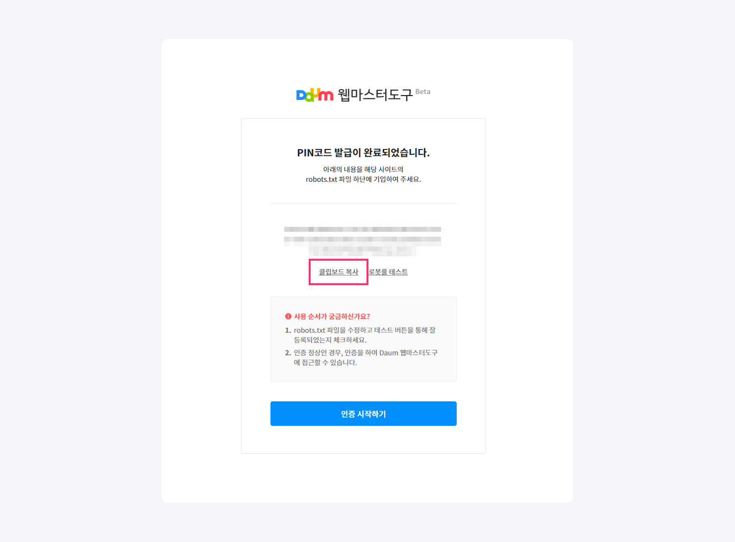 7. 다음 웹마스터도구 창으로 돌아와 인증 시작하기 버튼을 클릭해 주세요.
