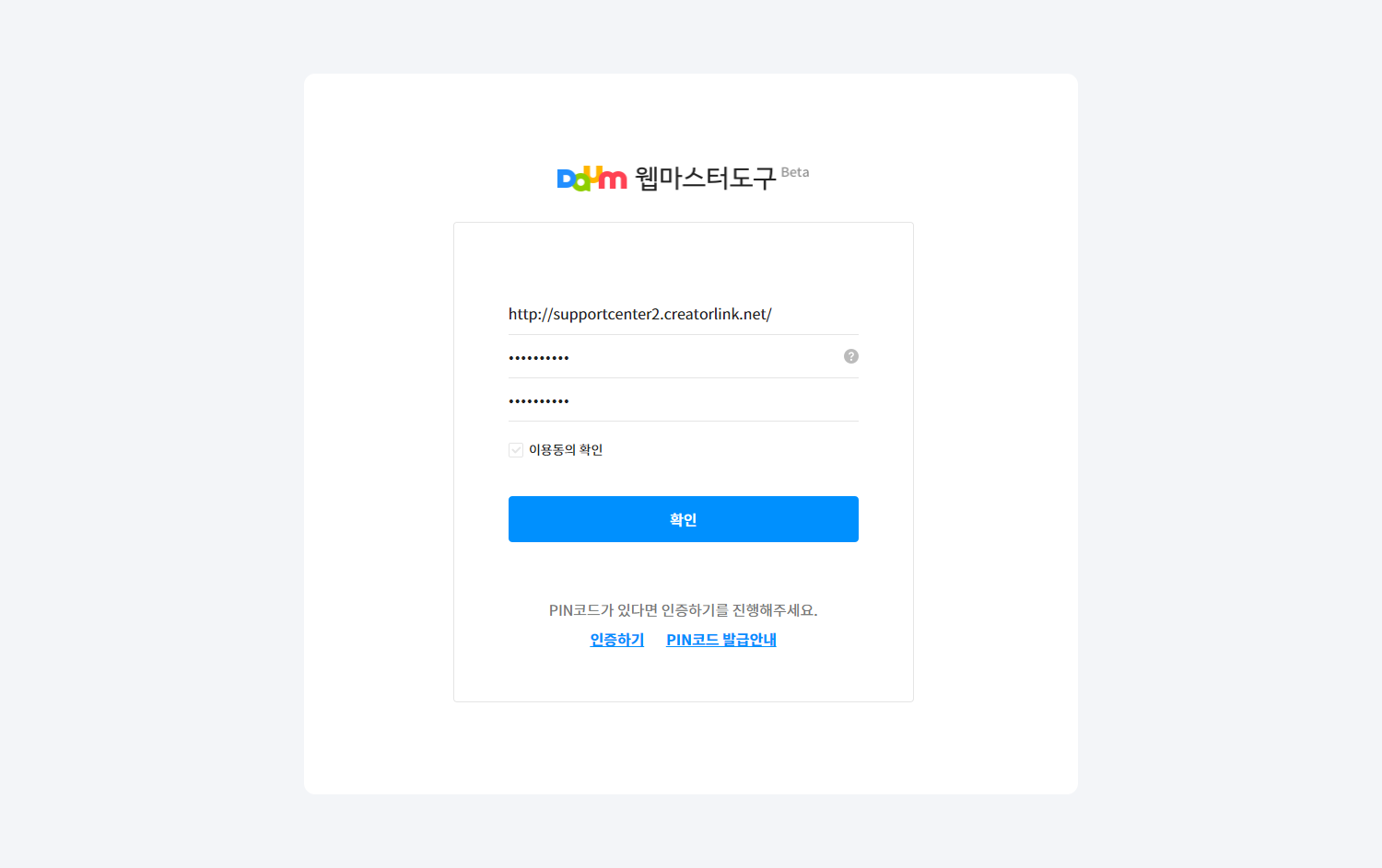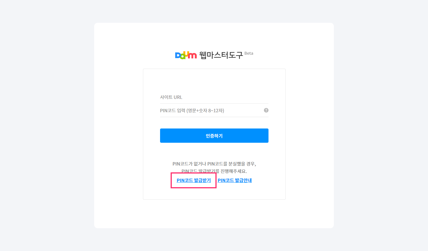1. 다음 웹마스터도구에 접속하여 PIN코드 발급받기 버튼을 클릭해 주세요.