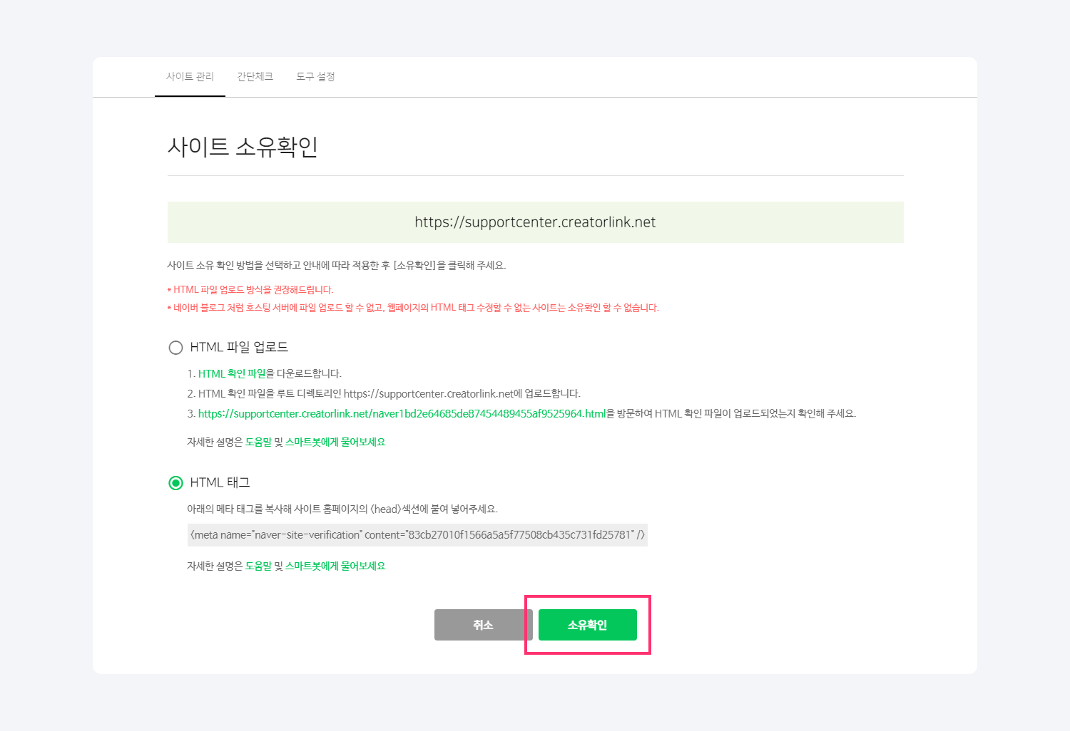 7. 네이버 웹마스터도구 페이지로 돌아가 소유 확인 버튼을 클릭하여 소유 확인을 완료합니다.