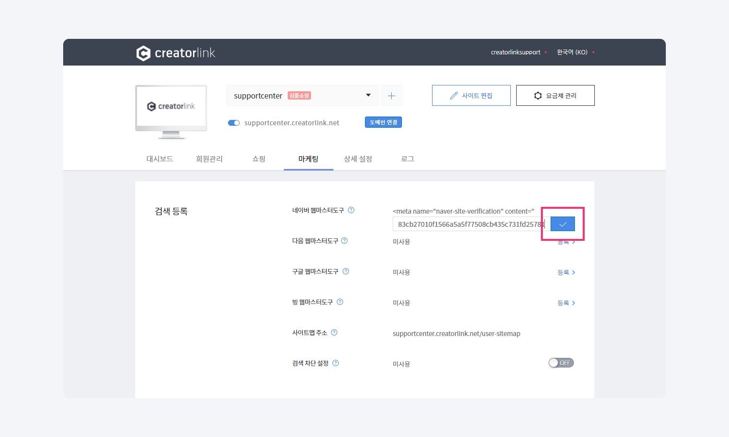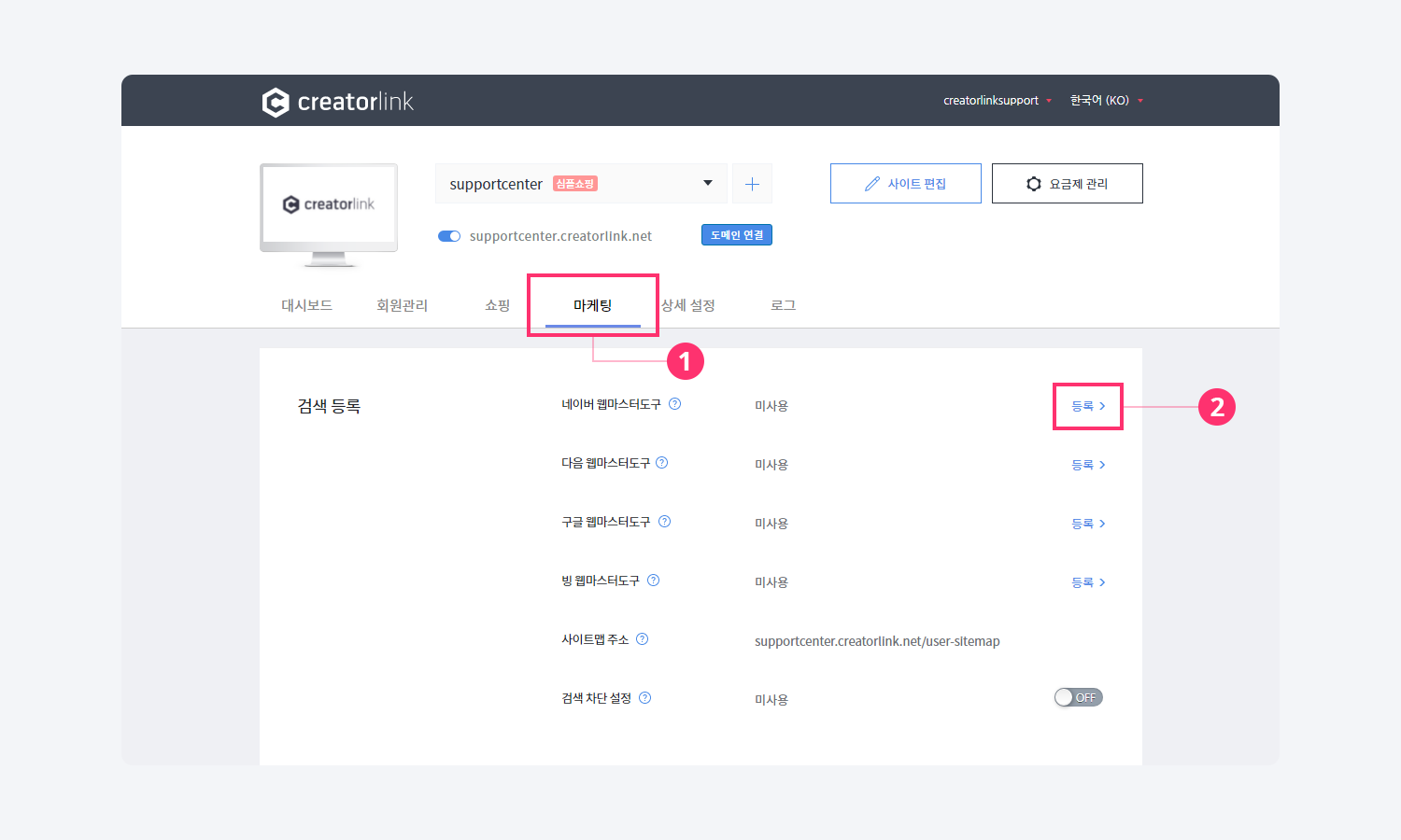 5. 크리에이터링크 관리자 페이지 > 마케팅 > 검색 등록 > 네이버 웹마스터도구 등록 버튼을 클릭해 주세요.
