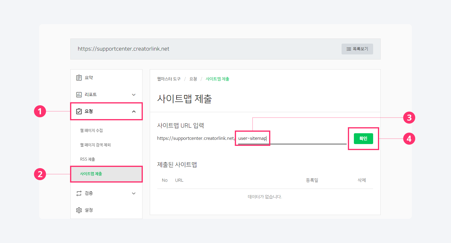 소유확인 완료 후, 검색봇이 사이트 구조를 잘 파악할 수 있도록 사이트맵을 등록해주시기 바랍니다.
