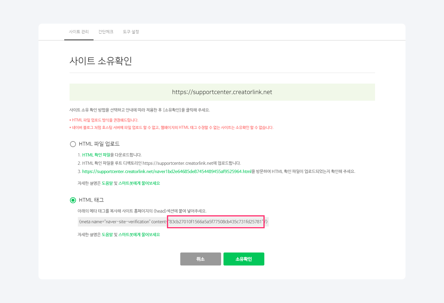 4. 사이트 소유확인 페이지에서 HTML 태그 옵션을 선택하고, 아래 메타태그 중 content 속성의 값을 복사해 주세요.