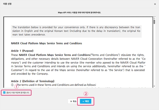 4) 이용약관 동의에 체크 후 확인 버튼을 클릭해 주세요.