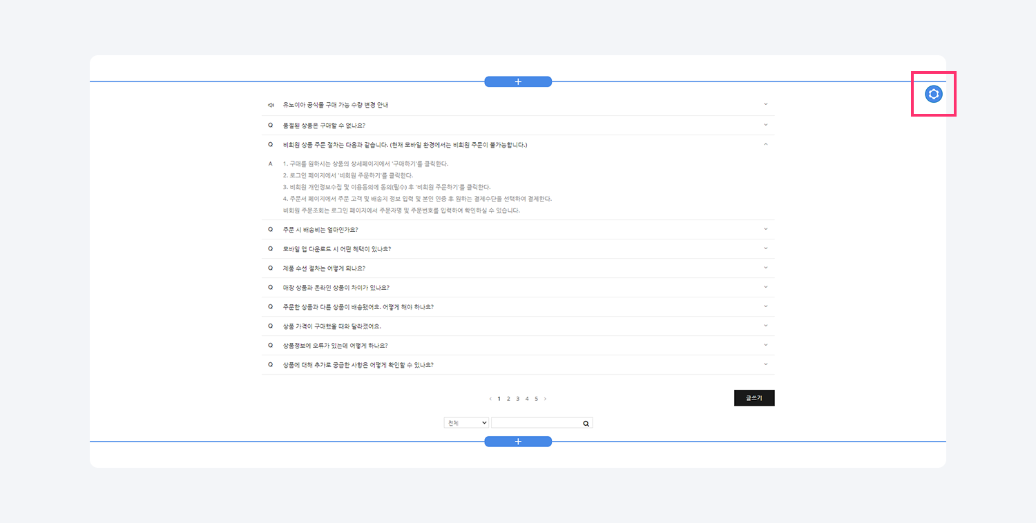 1. FAQ 게시판 블럭의 우측 상단 블럭 설정 아이콘을 클릭해 주세요.