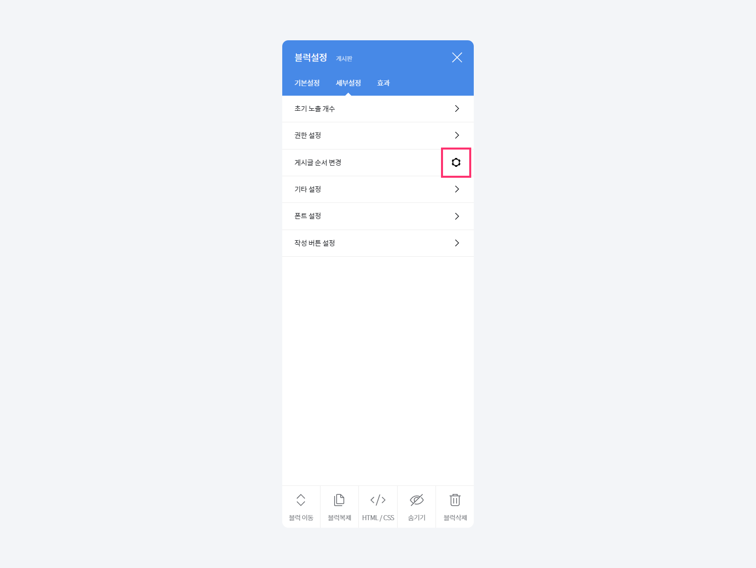 2. 세부설정 > 게시글 순서 변경 설정 아이콘을 클릭해 주세요.