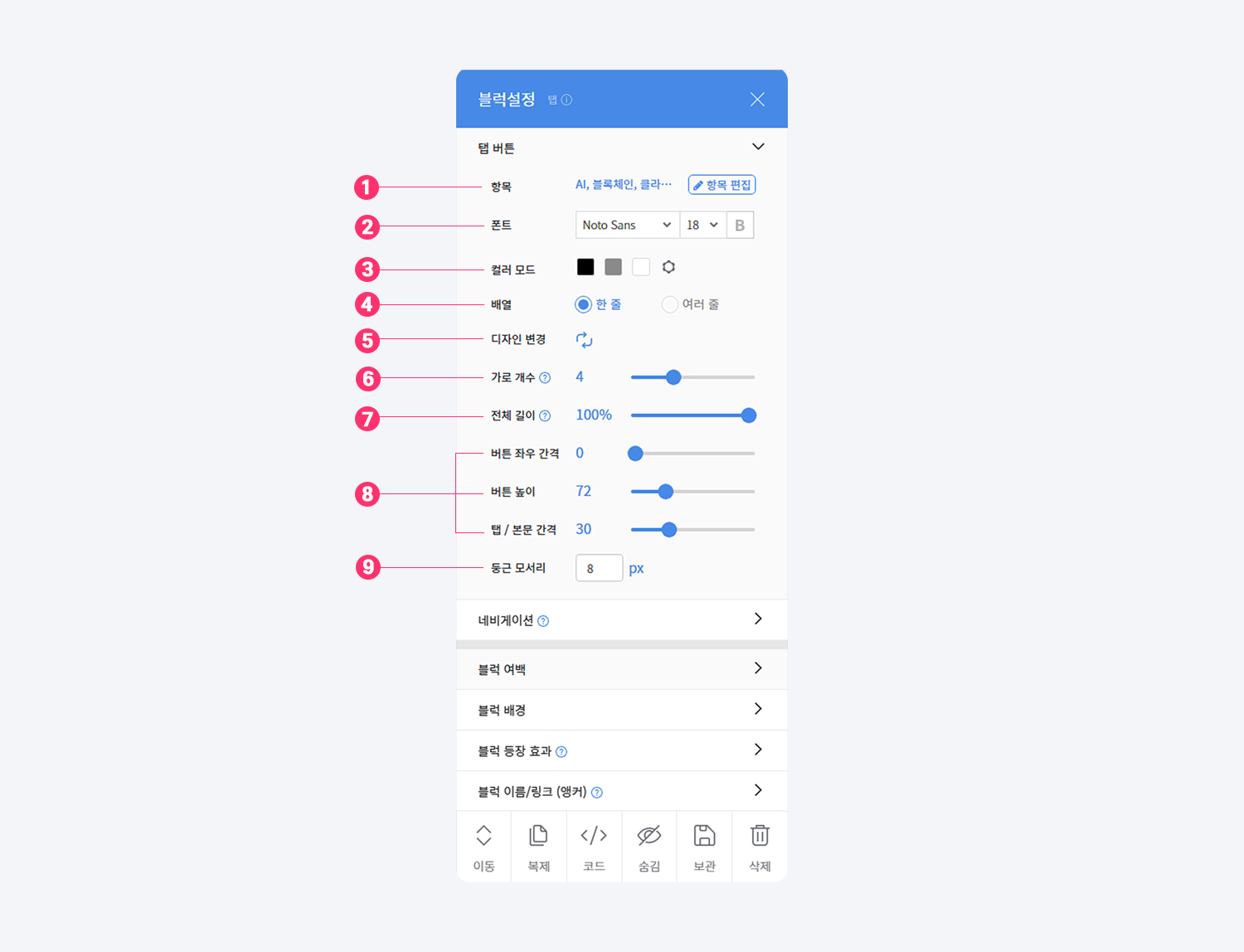 1-2. 네비게이션 : 탭 블럭의 네비게이션 버튼을 추가, 편집할 수 있어요.