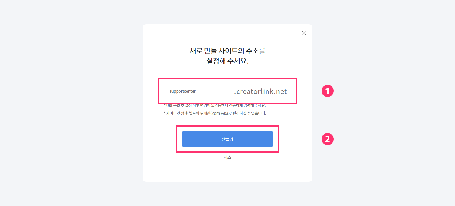 3. 원하는 도메인 주소를 입력하고 만들기 버튼을 클릭해 주세요.