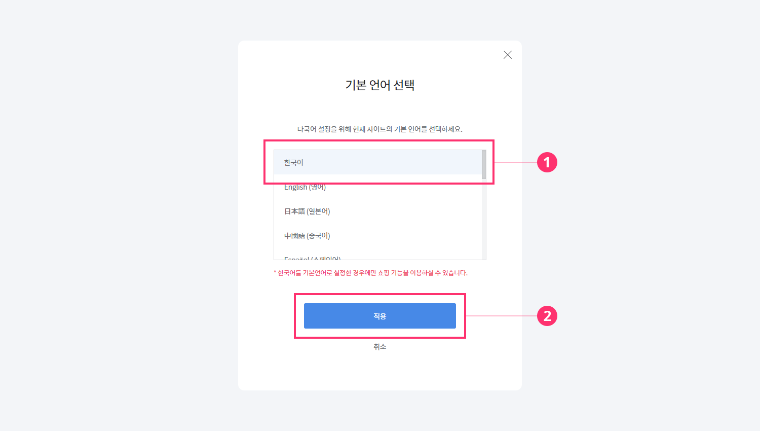 3. 기본 언어에서 원하는 언어를 선택 후 적용해 주세요.