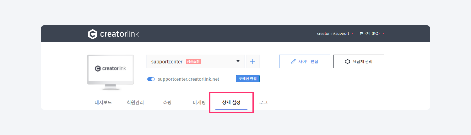 1. 관리자 페이지 > 상세 설정을 클릭해 주세요.